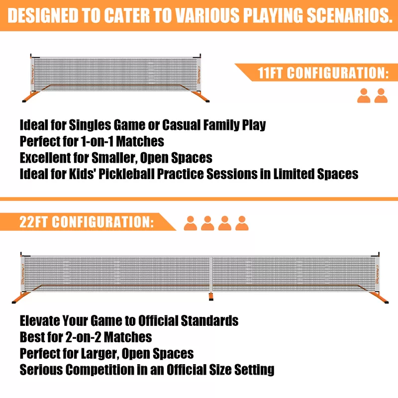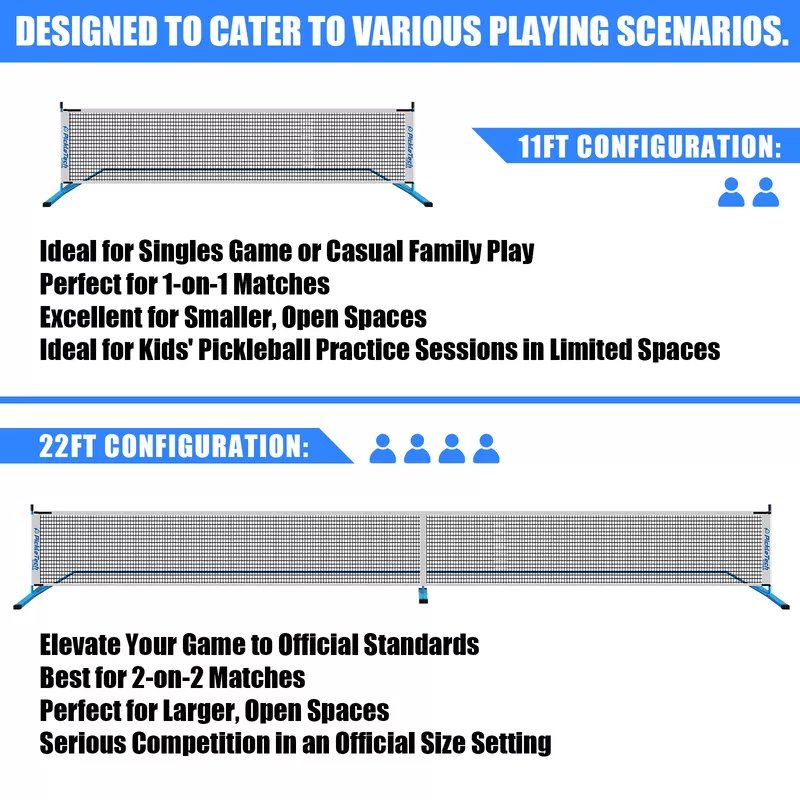 The PICKLETECH 6.0 Cross Version 2-in-1 Pickleball Net is designed for players who want flexibility without compromise. Featuring both a full-size 22 ft regulation net and an 11 ft half-court option, it adapts easily to casual practice or competitive play. A reinforced non-slip base keeps the net stable on any surface, while the elastic mesh maintains proper tension. Lightweight, tool-free, and portable, it’s ideal for driveways, backyards, and outdoor courts.