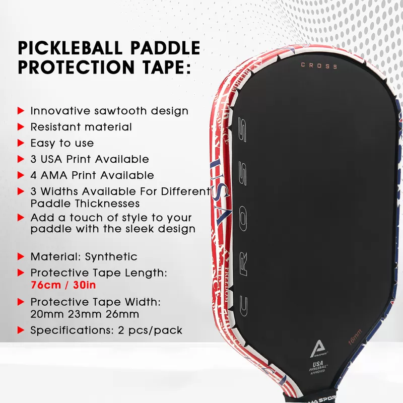 Express your style and protect your paddle with our USA-themed protection tape. Featuring exclusive city and state prints alongside the iconic AMA logo, this tape adds personality while guarding against court scratches. Its innovative V-shaped edge ensures a wrinkle-free fit on curved paddles, and the durable material withstands intense play. Available in multiple widths for different paddle thicknesses, it’s both easy to apply and built to last.
