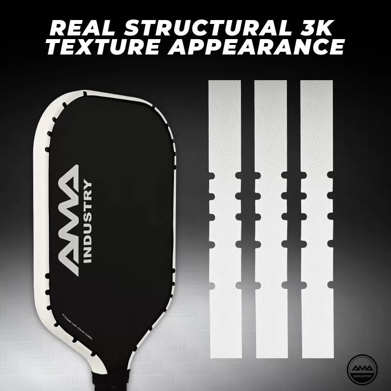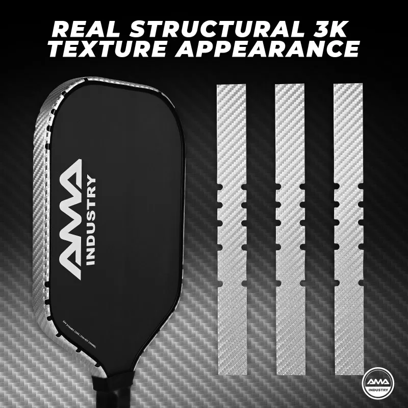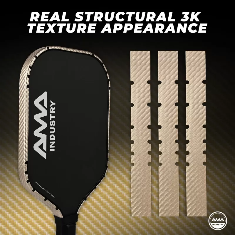 Structured Carbon-Inspired Edge Protection Tape. The T002 series features a material-based texture solution that replicates real 3K carbon fiber aesthetics through structural forming, not surface printing. Available colors: Black | Gold | Silver | White. Authentic woven-style texture with depth and realism. Advanced material forming process for enhanced surface performance. Metallic finish options suitable for premium product positioning. Adjustable dimensions to match various paddle profiles. Applicable to pickleball, padel, and beach tennis rackets. Combines visual enhancement with functional edge protection. Durable material structure designed for long-term wear resistance. A suitable option for carbon-style paddle collections and performance-oriented product lines.